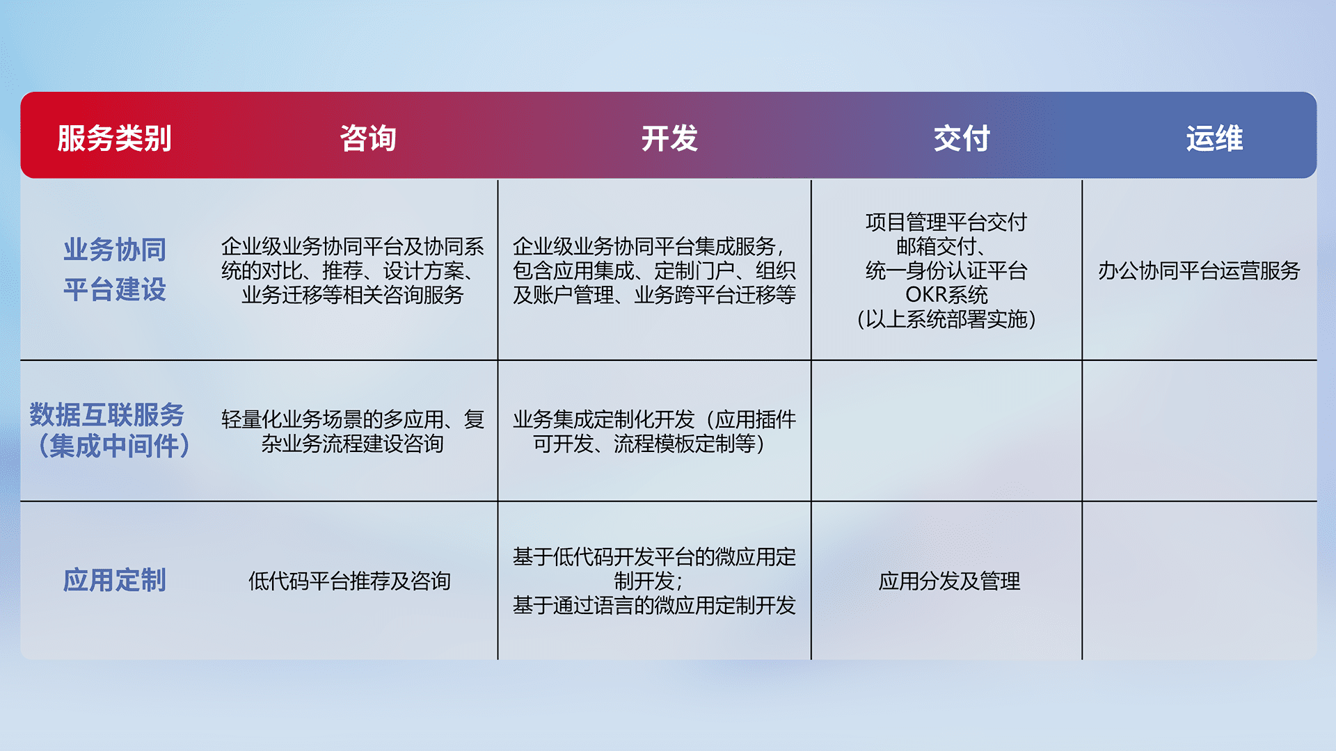 针对钉钉、、、企微、、、、IDaas等平台级产品提供产品的规划、、、、方案、、、、交付、、定制化开发等服务,,,实现如统一协同办公、、、智能客户服务、、、、混合会议管理、、、智能数据查询、、等业务场景,,,实现数字化转型。。。